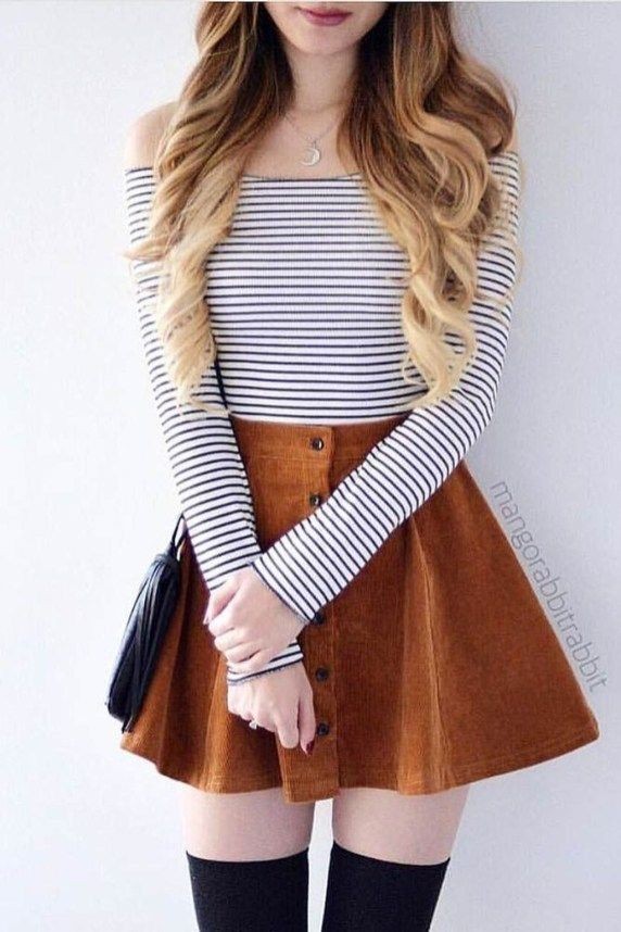 Well…if you found the first one too cute and the second one too casual. Then this MUST be for you!! It consists of a black and whte stripe top with an oldies but cute mini orange-brown skirt. This outfit is more formal and elegant but also with a hint of casual taste. Match it along with knee length socks, this outfit is probably best for going to the movies as it is not the most comfortable outfit for walking, at least no in this list, so sitting down for 2 hours might not be a bad idea for this outfit! As for hair, again, putting it down is amazing as always, but some other suggestions are like, 2 loose ponytails, double dutch braids or a high SIDE ponytail. Don’t forget to match it with a bag!!